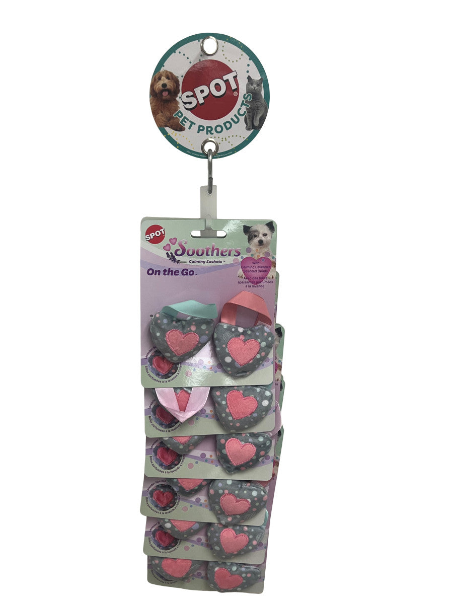 Soothers On the Go calming sachets are filled with lavender infused beads that release a fragrance to help soothe anxiety and stress. A ribbon allows you to hang these sachets anywhere your pet needs a comforting scent, on the go or at home. The 12 piece clip strip contains 12 of #54855 Soothers on the go 2 pack assorted 3