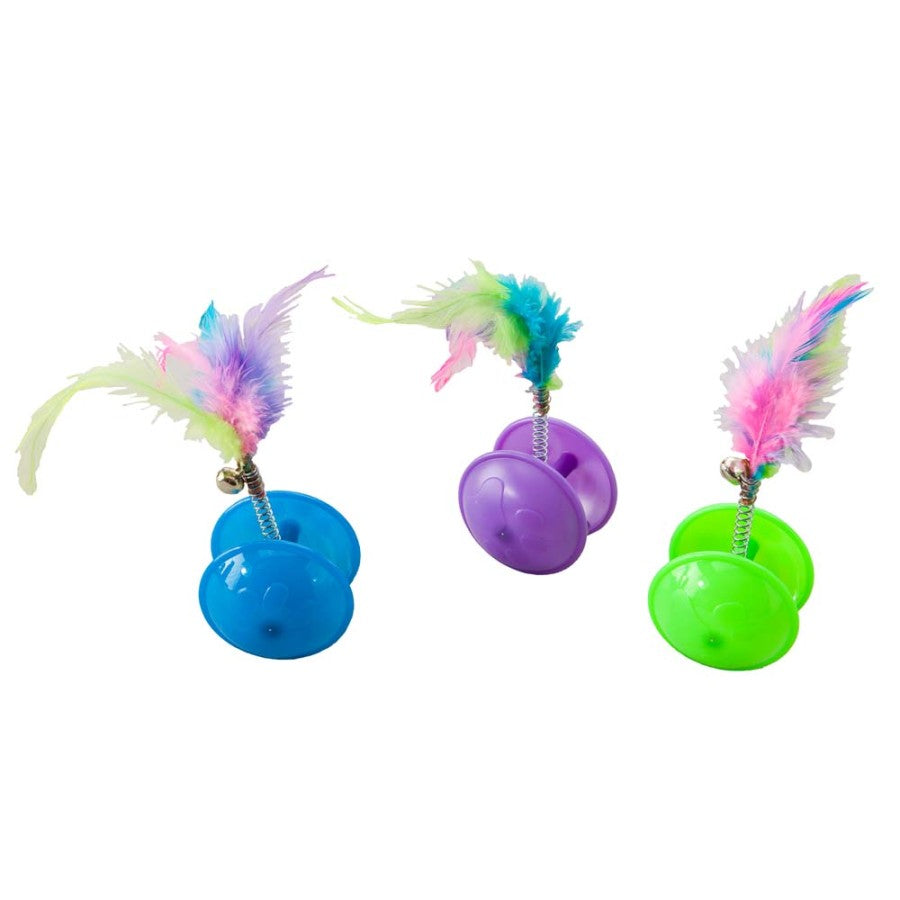 Tie Dye Cat Toys are bright, colorful plastic toys with catnip, feathers and bell for added fun! Rolls erratically!
