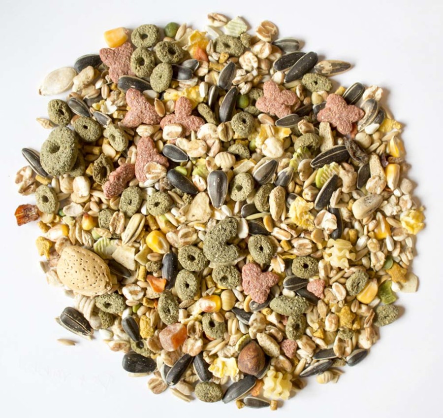 - Ingredients: Ground Corn; Sunflower Seed; Whole Corn; Safflower Seed; Wheat; Oats; Puffed Wheat; Dehulled Soybean Meal; Ground Wheat; Heat-Processed Soybeans; Heat-Processed Barley; Wheat Middlings; Flaked Peas; Whole Almonds; Dehydrated Banana; Dehydrated Apricot; Flaked Corn; Corn Gluten Meal; Raisins; Split Green Peas; Dehydrated Alfalfa Meal; Dates; Calcium Carbonate; Whole Peanuts; Filberts; Pumpkin Seed; Flaked Red Beans; Dehydrated Coconut; Dehydrated Carrots; Dried Rose Hips; Dehydrated Apple; Chili Peppers; Pistachios; Vegetable Oil; Monocalcium Phosphate; Dicalcium Phosphate; L-Lysine; Salt; Algae Meal; Dried Egg; Ground Oat Groats; Potassium Chloride; Steam Rolled Oats; Orange Oil Extract; Magnesium Oxide; Vitamin A Supplement; Choline Chloride; Dried Lactobacillus Acidophilus Fermentation Product; Dried Lactobacillus Casei Fermentation Product; Dried Enterococcus Faecium Fermentation Product; Dried Bifidobacterium Bifidum Fermentation Product; Dried Aspergillus Oryzae Fermentation Product; Torula Dried Yeast; Yucca Schidigera Extract; DL-Methionine; Yeast Culture; Vitamin D3 Supplement; Vitamin E Supplement; Fructooligosaccharide; Sesame Seed; Peanuts; Pot Marigold; Zinc Methionine Complex; Manganese Methionine Complex; Copper Lysine Complex; Cobalt Glucoheptonate; Niacin Supplement; Vitamin B12 Supplement; Riboflavin Supplement; d-Calcium Pantothenate; Menadione Sodium Bisulfite Complex; Biotin; Folic Acid; Thiamine Mononitrate; Pyridoxine Hydrochloride; L-Ascorbyl-2-Polyphosphate; Zinc Sulfate; Zinc Oxide; Ferrous Sulfate; Manganous Oxide; Manganese Sulfate; Copper Sulfate; Potassium Iodide; Cobalt Sulfate; Sugar; Carmine Color; Sodium Selenite