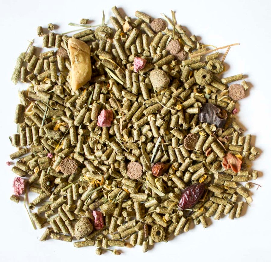 - Ingredients: Timothy Meal; Soybean Hulls; Dehulled Soybean Meal; Wheat Middlings; Ground Wheat; Carob Beans; Ground Flax Seed; Chopped Timothy Grass Hay; Dehydrated Carrots; Ground Corn; Brewers Dried Yeast; Dried Rose Hips; Dehydrated Alfalfa Meal; Salt; Dehydrated Apple; Dried Calendula Flowers; Dried Chamomile Flowers; Dehydrated Savoy Cabbage; Calcium Carbonate; Ground Beets; Dried Plain Beet Pulp; Vegetable Oil; Ground Rolled Oats; Ground Peppermint Leaf; Ground Raspberry Leaf; Ground Dandelion Leaf; Yeast Culture; Algae Meal; Magnesium Oxide; Potassium Sulfate; Magnesium Sulfate; Papaya Powder; Wheat Germ Meal; Choline Chloride; Vitamin A Supplement; Dried Lactobacillus Acidophilus Fermentation Product; Dried Lactobacillus Casei Fermentation Product; Dried Enterococcus Faecium Fermentation Product; Dried Bifidobacterium Bifidum Fermentation Product; Vitamin E Supplement; Vitamin D3 Supplement; Fructooligosaccharide; Niacin Supplement; Vitamin B12 Supplement; Riboflavin Supplement; d-Calcium Pantothenate; Menadione Sodium Bisulfite Complex; Biotin; Folic Acid; Thiamine Mononitrate; Pyridoxine Hydrochloride; L-Ascorbyl-2-Polyphosphate; Zinc Sulfate; Zinc Methionine Complex; Manganese Methionine Complex; Copper Lysine Complex; Cobalt Glucoheptonate; Ferrous Sulfate; Manganous Oxide; Manganese Sulfate; Copper Sulfate; Ethylenediamine Dihydroiodide; Cobalt Sulfate; Yucca Schidigera Extract; Sodium Selenite