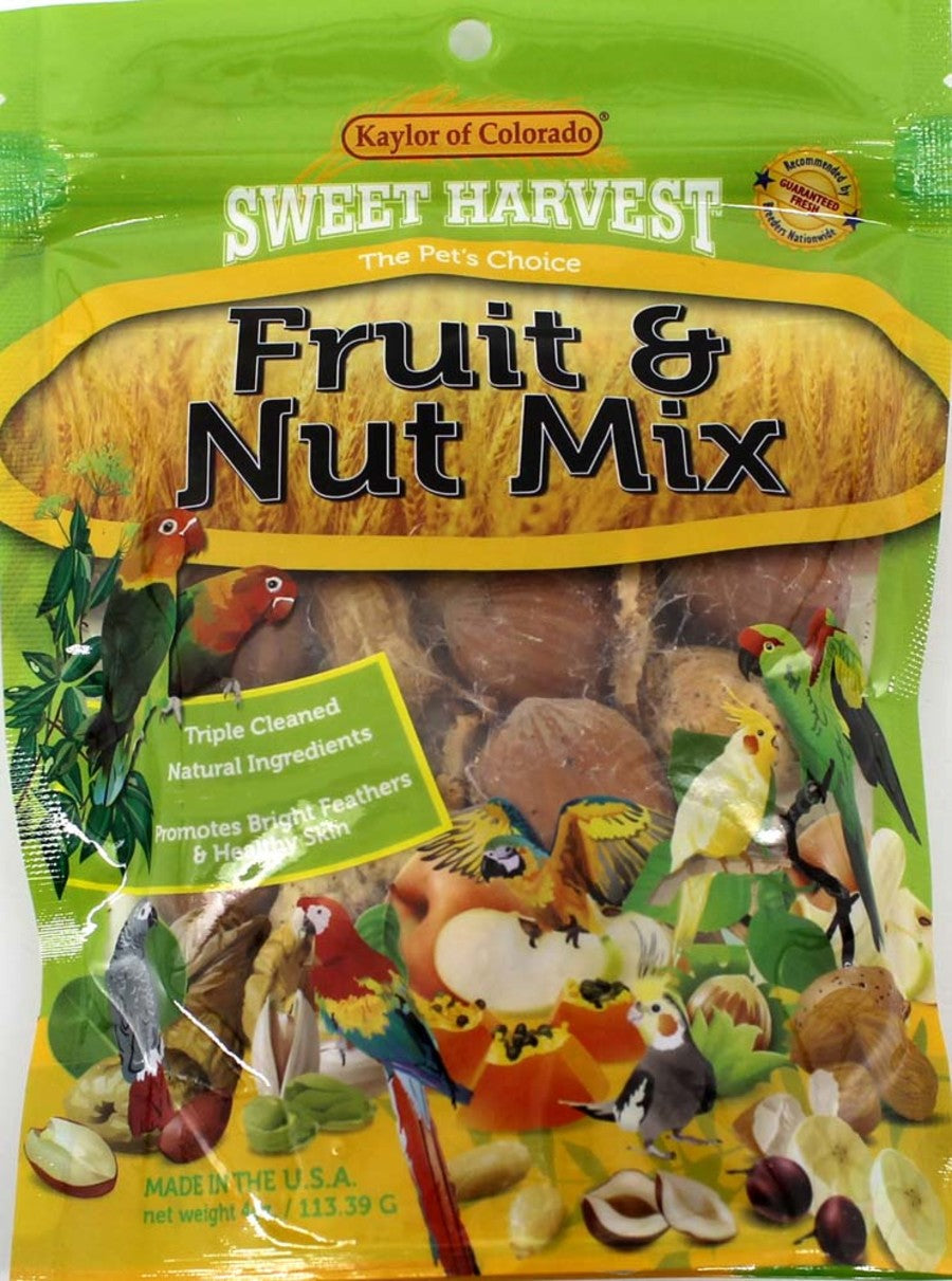 Made from nutritious Almonds, Filberts, Bananas, Pistachios, Peanuts, Raisins, Papaya, Walnuts, Pine Nuts and Apples. This is a healthy & delicious treat for your favorite pet bird. Packed in a reasealable pouch.