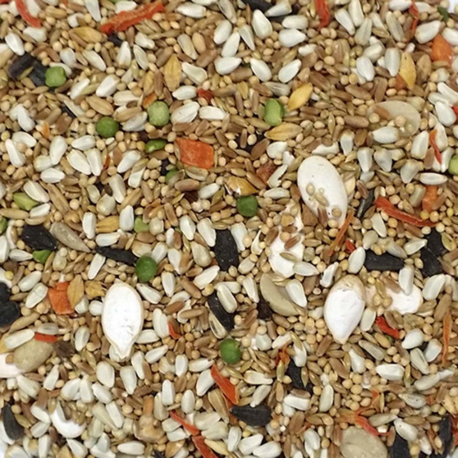 - Ingredients: Safflower Seed; White Proso; Canary Seed; Wheat; Oat Groats; Green Peas; Barley; Buckwheat; Black Oil Sunflower Seeds; Pumpkin Seeds; Papaya; Carrot; Raisins; Peanuts; Cuttlebone; Cinnamon Sticks; Safflower Oil; Soy Flour; Vitamin E Supplement; Zinc Oxide; Ferrous Sulfate; Calcium Carbonate; Niacin; Vitamin A Acetate; Copper Sulfate; Ascorbic Acid; Sodium Chloride; Thiamine Mononitrate; Vitamin D3 Supplement; Riboflavin; Pyridoxine Hydrochloride; Folic Acid; Calcium Pantothenate; Vitamin B12 Supplement; Inositol; Potassium Chloride; Magnesium Oxide; Dicalcium Phosphate; Choline Chloride; Manganous Oxide; Ethylenediamine Dihydriodide