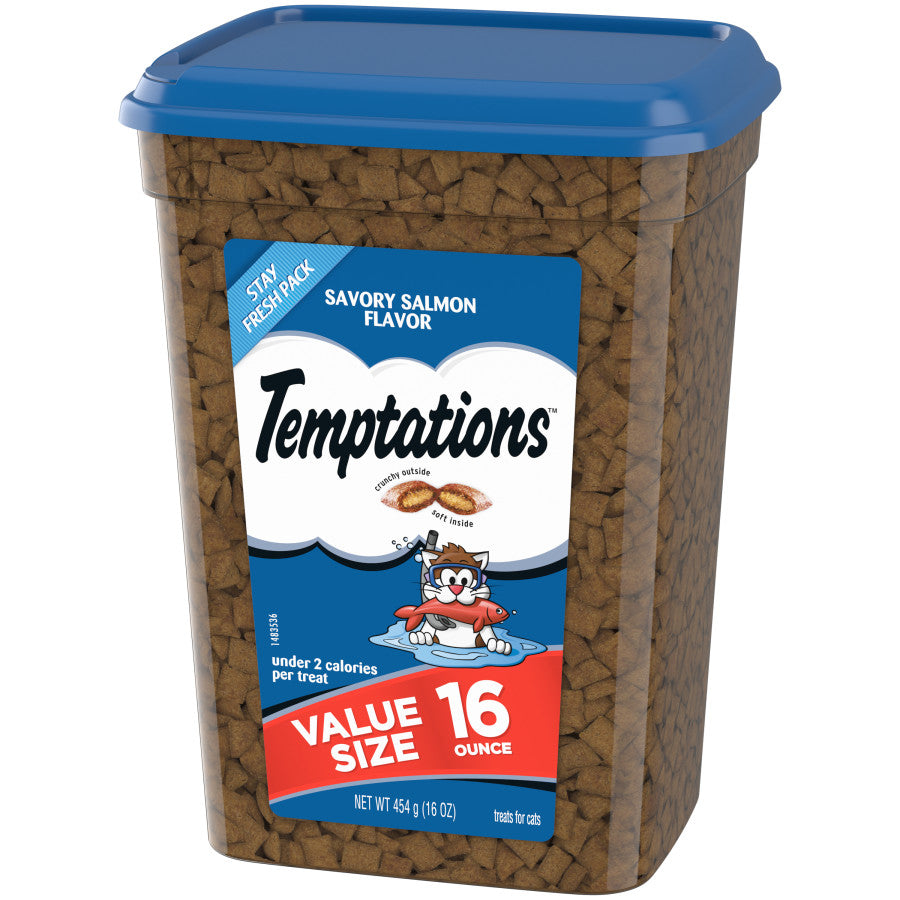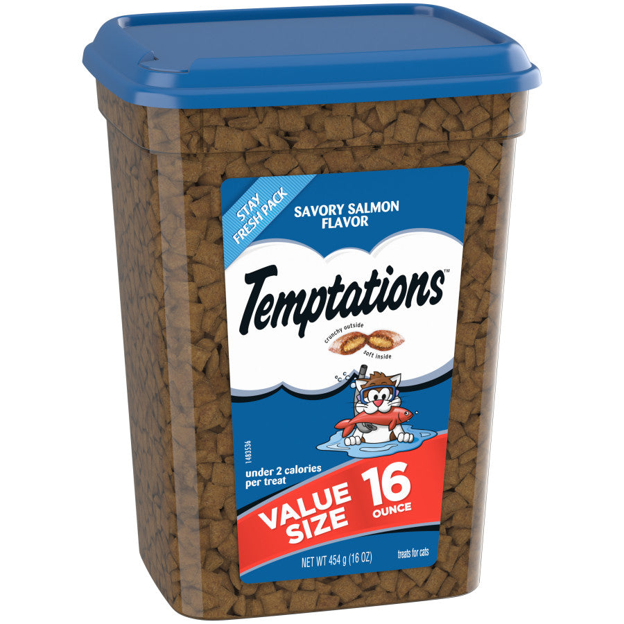 - Contains one (1) 16 oz. tub of TEMPTATIONS Classic Cat Treats Savory Salmon Flavor