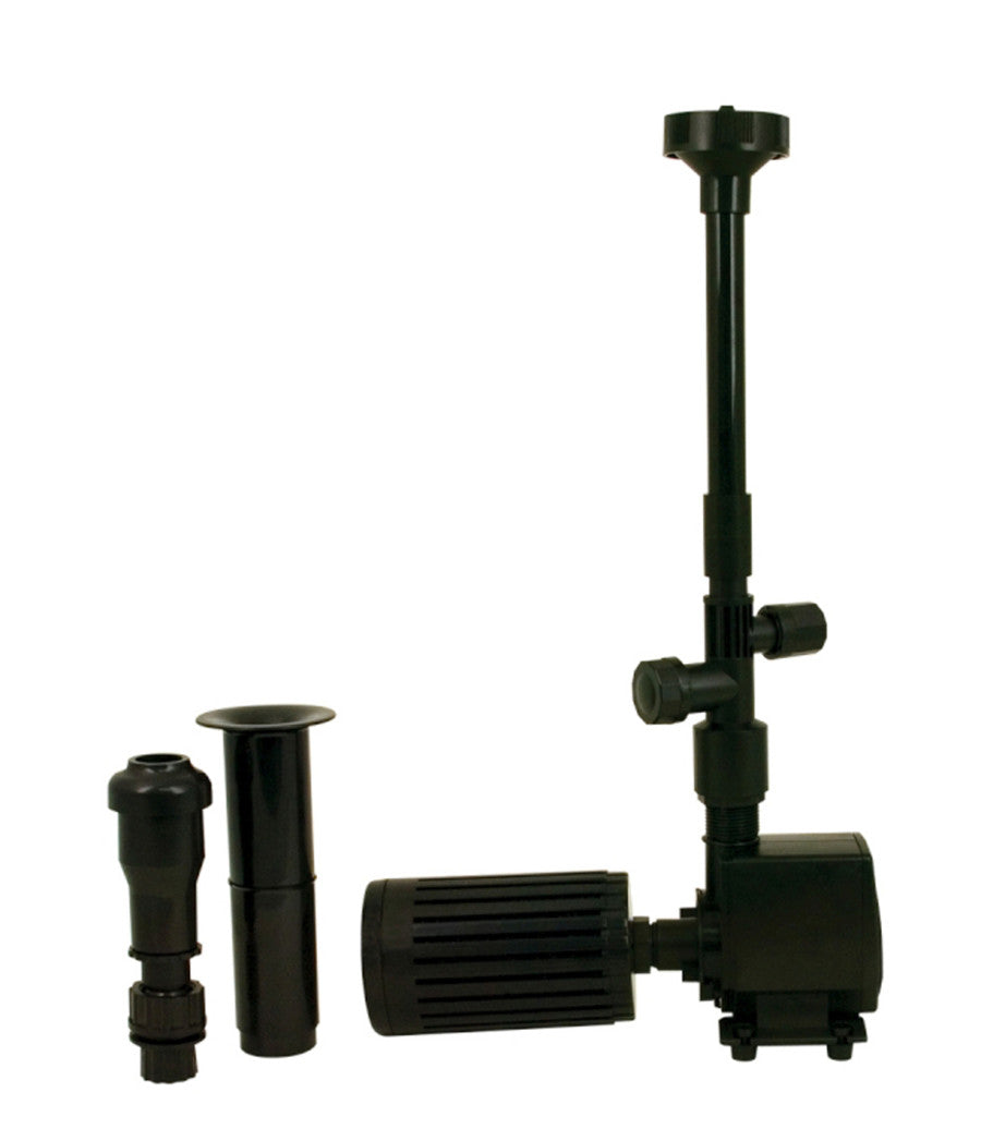 Fountain Assembly includes three fountain heads (frothy spray and bell pattern) swivel adjuster for leveling fountain heads and diverter assembly. Submersible flat box filter keeps pond clean reduces pump and fountain clogging. Flat box filter includes a coarse and fine pad along with tubing and fittings for pump connection. The submersible pump pushes 325 gallons per hour at 1 foot. 12 foot cord. UL listed. 3 year limited warranty.