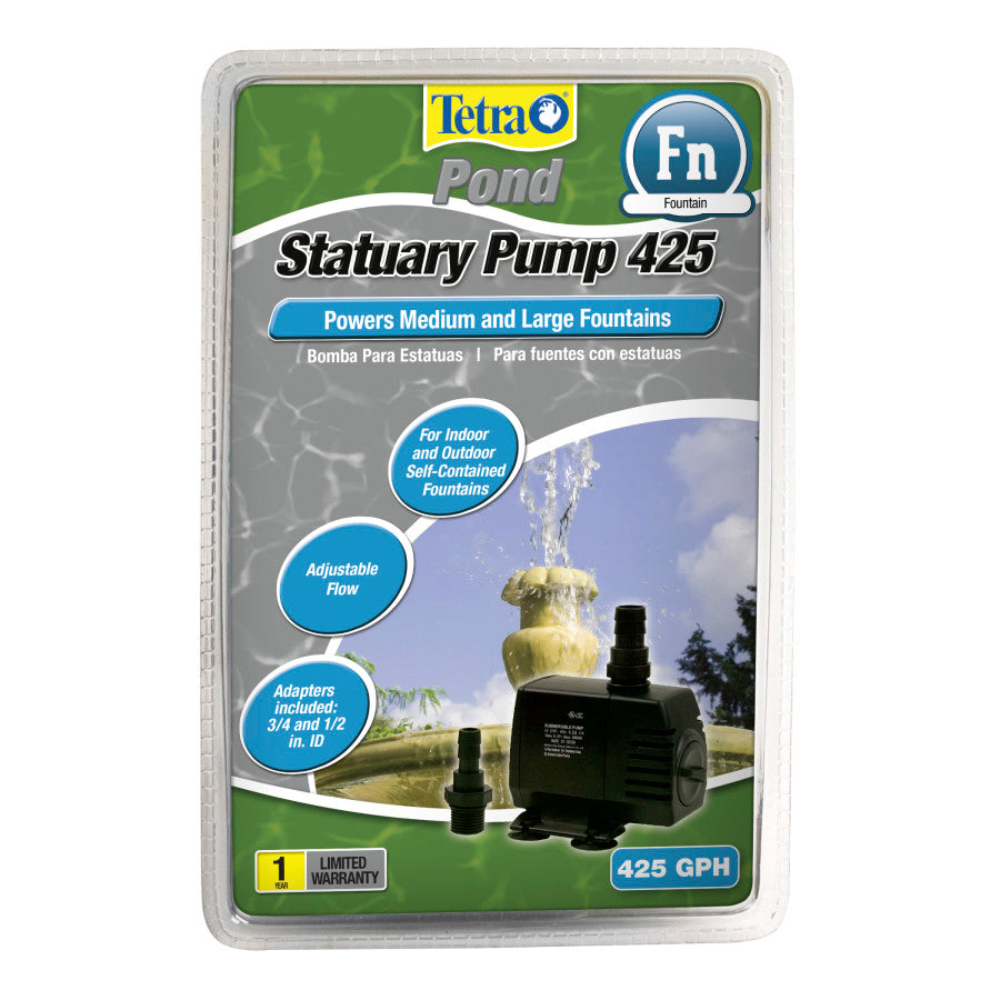 Statuary Pump 425 - For indoor and outdoor self-contained Medium and Large Fountains. Adjustable flow and 1 year limited warranty. Adaptors included: 3/4 and 1/2in ID