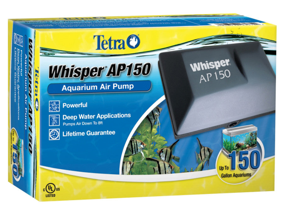 These Whisper Air Pumps are Tetra's most powerful line of air pumps. The pumps are designed for situations that produce greater back pressure, such as deep tanks (up to 8 feet deep), long decorator air stones, multiple air stones in one or more tanks, and protein skimmers for saltwater. UL listed. AP 150 shown.