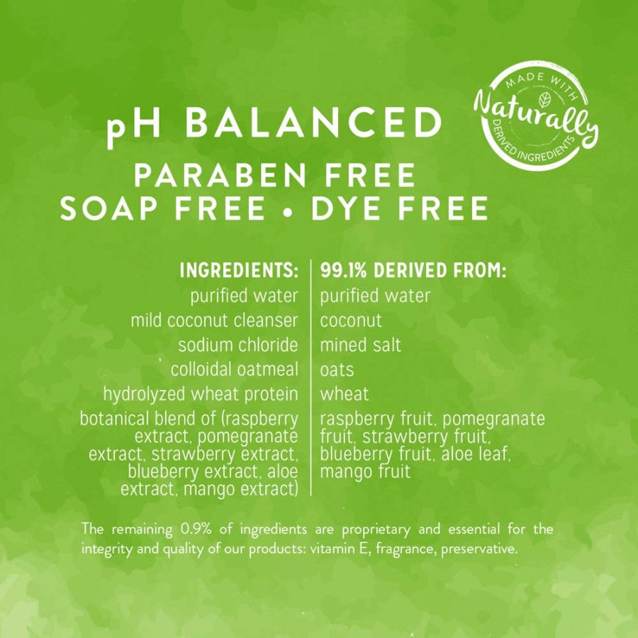 - Ingredients: Purified Water, Mild Coconut Cleanser, Avena Sativa Oatmeal, Organic Blend of (Raspberry Extract, Pomegranate Extract, Strawberry Extract, Blueberry Extract, Mango Extract), Hydrolyzed Plant Protein, Fragrance, Vitamin E