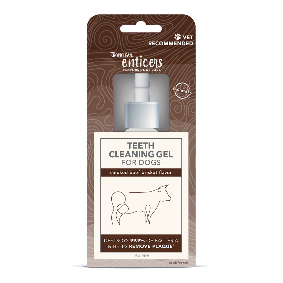 Say hello to your dog's new favorite delicacy. TropiClean Enticers Teeth Cleaning Gel is a savory oral care solution with a flavor that will have your dog begging for clean teeth. Gel is made with naturally derived ingredients and proven to destroy 99.9% of harmful bacteria found in the mouth - helping to remove plaque and reduce bad breath.