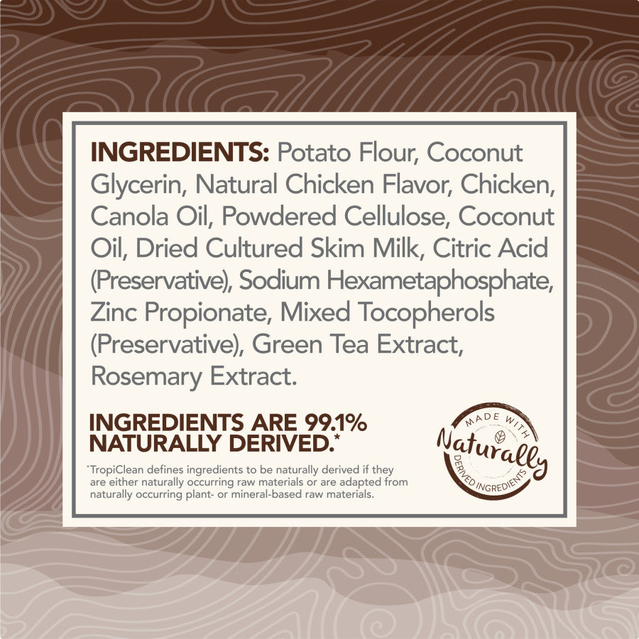 Now the flavors your dog loves are the flavors that give them clean teeth and a healthy mouth! TropiClean Enticers Teeth Cleaning Sticks are specially designed and textured to give your dog a complete teeth brushing with every bite. The flavors will leave their mouth watering for more! Sticks are made with naturally derived ingredients and will satisfy your dog's innate desire for lip-smacking goodness with one teeth cleaning stick per day.