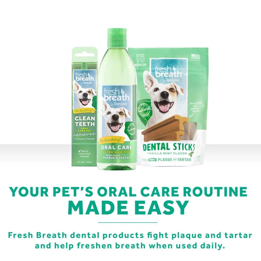 Fresh Breath by TropiClean offers many oral care solutions to help make your pet's dental care routine easier! By using Fresh Breath by TropiClean's Clean Teeth Oral Care Gel, you can support your pet's oral health and give them fresh breath — no brushing required! This tasty mint flavored gel helps remove plaque and tartar safely and effectively, and helps freshen your dog's breath when used daily as part of an oral care routine. Use in combination with Fresh Breath by TropiClean Oral Care Water Additive and Fresh Breath by TropiClean Dental Chews or Dental Sticks for maximum oral care protection.