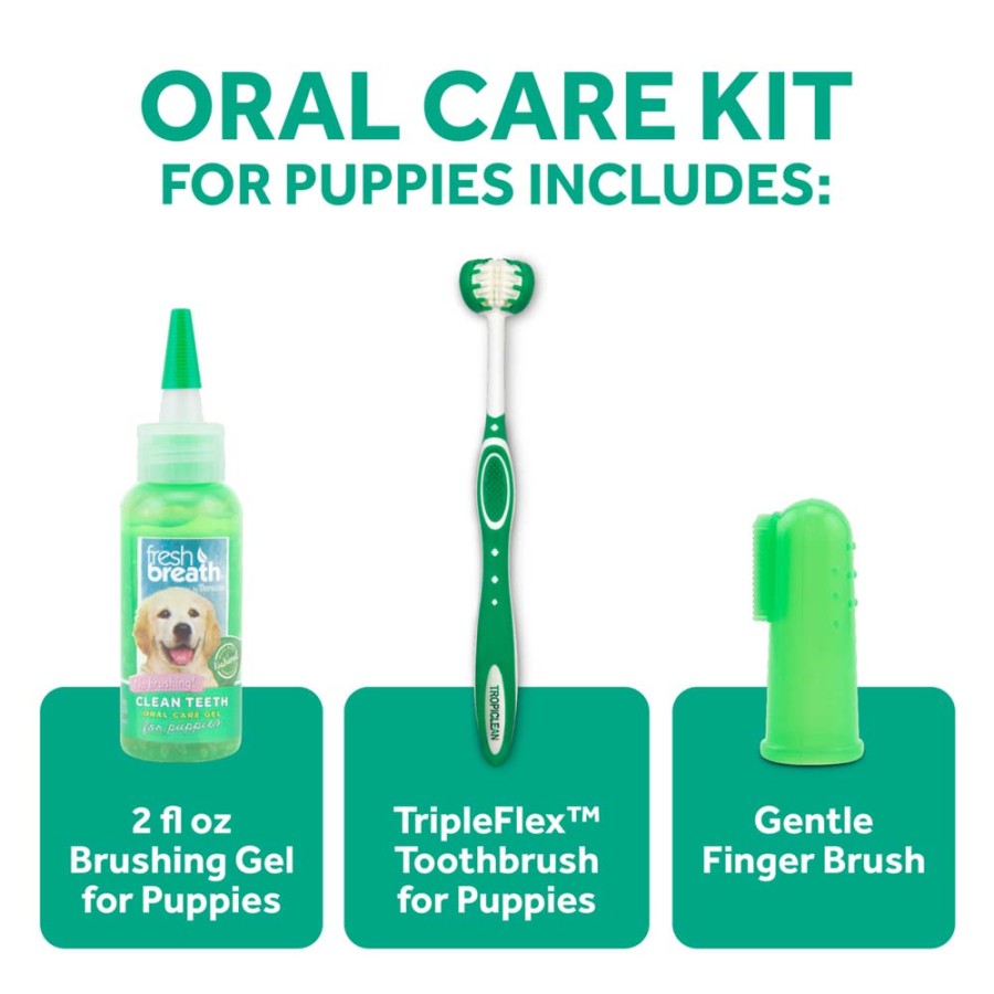 Oral care is about more than making your pets’ smiles sparkle—it’s an important component of their overall health. In fact, 80% of dogs begin to show signs of oral disease by age 3. Our Fresh Breath Oral Care Kit includes our TripleFlex™ Toothbrush, Finger Brush and our Brushing Gel for Dogs. Our Brushing Gel for Dogs is infused with green tea leaf extract that naturally defends against plaque and tartar and clings to their teeth for a superior clean. Our TripleFlex Toothbrush cleans 3x faster with its easy 360-degree bristles. Also included is our Finger Brush which allows you to gently clean helping dissolve plaque and tartar. Clean teeth, healthy mouth, happy dog.