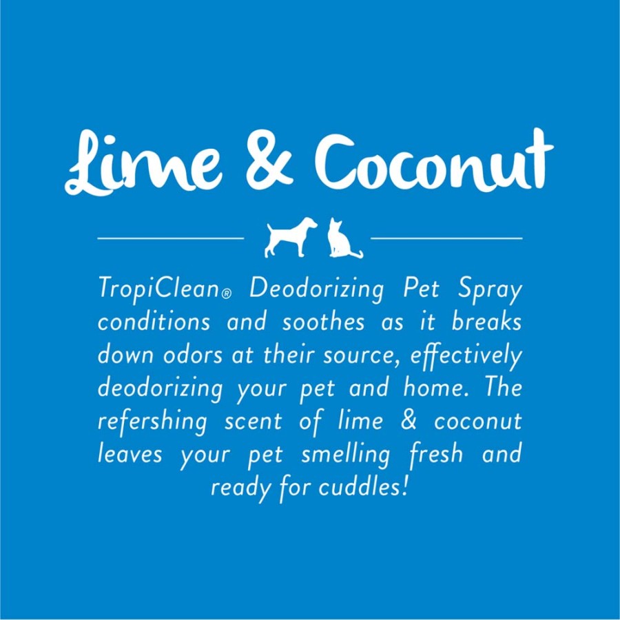 TropiClean Deodorizing Pet Spray conditions and soothes as it breaks down odors at their source, effectively deodorizing your dog, cat and home. The refreshing scent of lime and coconut leaves your pet smelling fresh and ready for cuddles!