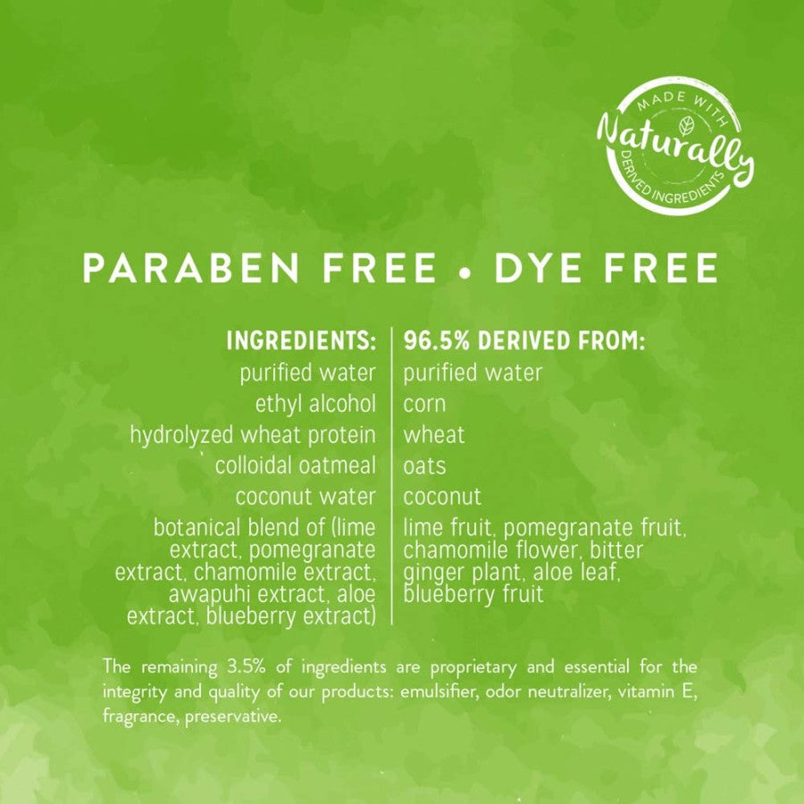 - Ingredients: Purified Water, Ethyl Alcohol (Corn) Hydrolyzed Wheat Protein, Colloidal Oatmeal, Coconut Water, Botanical Blend of (Lime Extract, Lime Fruit, Pomegranate Fruit, Chamomile Flower, Bitter Ginger, Pomegranate Extract, Chamomile Plant, Aloe Leaf, Blueberry Fruit Extract, Awapuhi Extract, Aloe Extract, Blueberry Extract) Emulsifier, Odor Neutralizer, Vitamin E, Fragrance, Preservative