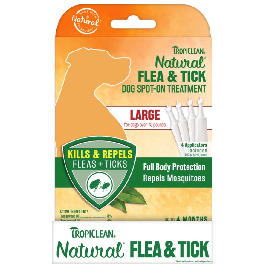 TropiClean Natural Flea and Tick Dog Spot-On Treatment for medium dogs is made with natural active ingredients, cedarwood and peppermint oils, and is safe when used as directed to protect and defend against those irritating fleas, ticks and mosquitoes. Our water resistant spot-on treatment is a full body repellent for dogs 35-75 pounds that effectively protects your furry friend.