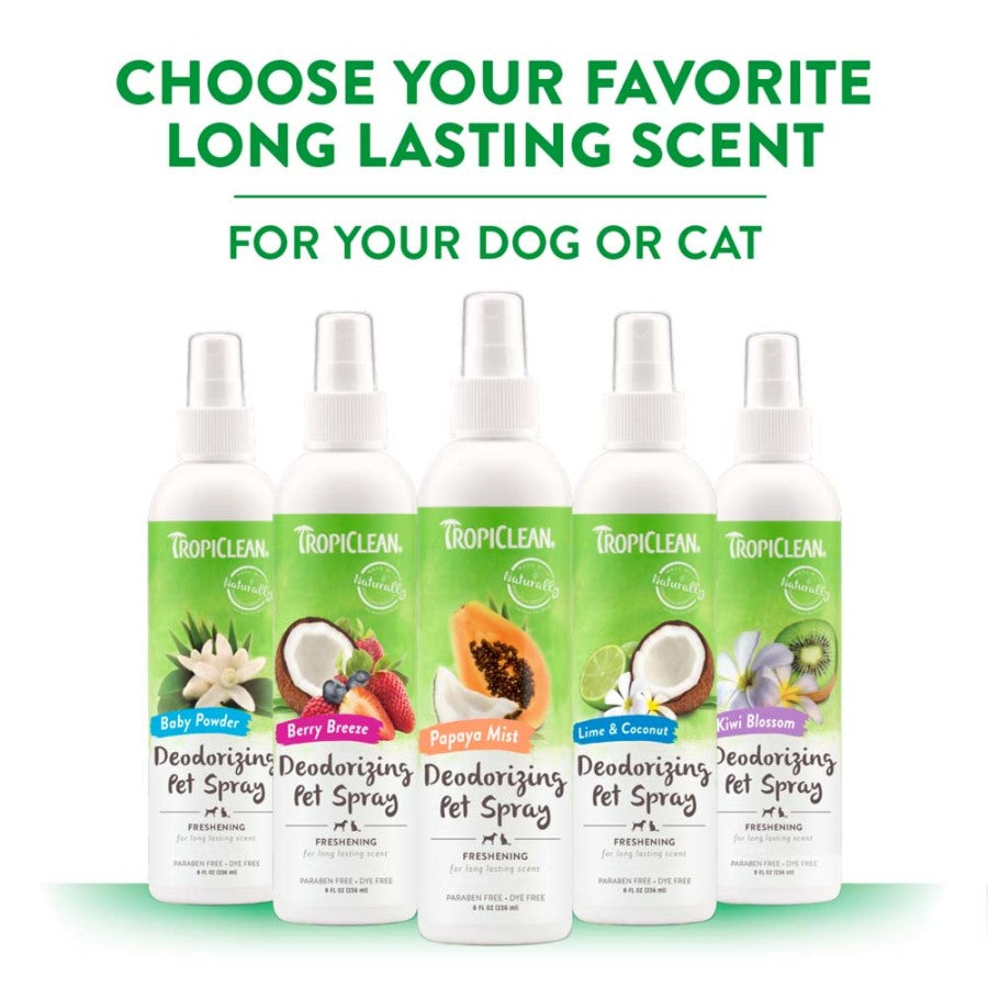 TropiClean's Pure Plum Deodorizing Pet Spray for pets eliminates odors by attacking the odor at its source and breaking it down, leaving behind a fresh and pleasant scent. Eliminates odors from: urine, skunk, feces, glandular secretions, vomit, and all general pet odors.
