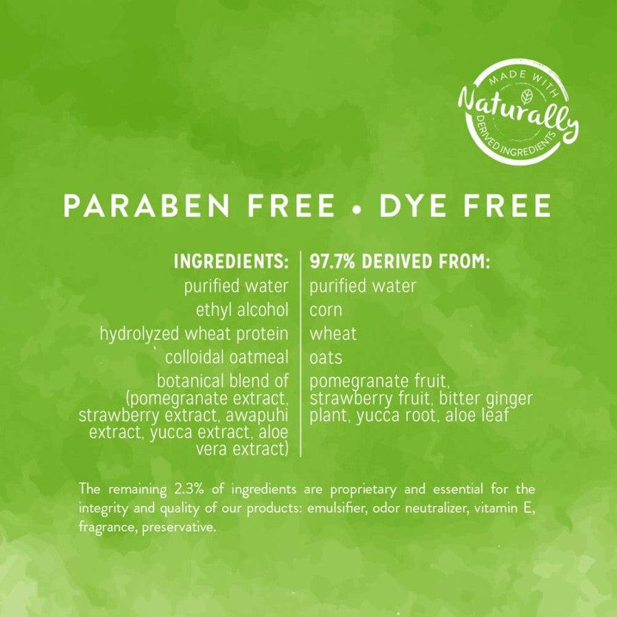 - Ingredients: Purified Water, Ethyl Alcohol (Corn) Hydrolyzed Wheat Protein, Colloidal Oatmeal, Coconut Water, Botanical Blend Of (Lime Extract, Lime Fruit, Pomegranate Fruit, Chamomile Flower, Bitter Ginger, Pomegranate Extract, Chamomile Plant, Aloe Leaf, Blueberry Fruit Extract, Awapuhi Extract, Aloe Extract, Blueberry Extract) Emulsifier, Odor Neutralizer, Vitamin E, Fragrance, Preservative