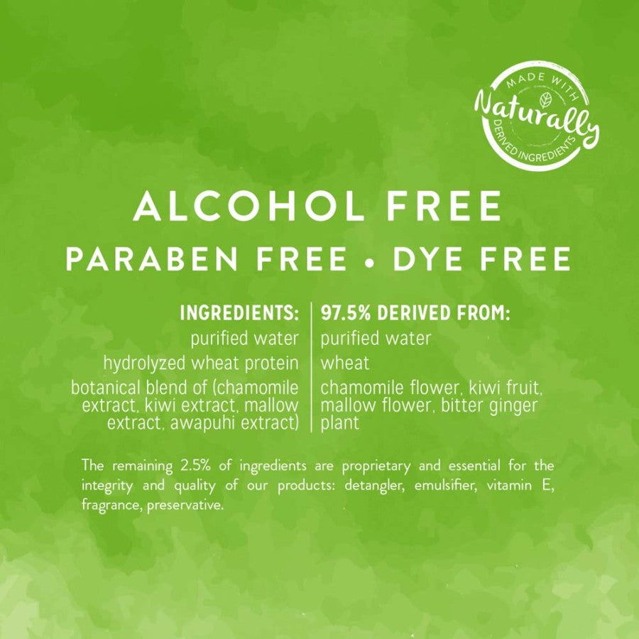- Ingredients: Purified Water, Hydrolyzed Plant Protein, Organic Blend of (Chamomile Extract, Kiwi Extract, Mallow Extract, Awapuhi Extract), Proprietary Cationic Emulsion, Fragrance, Vitamin E.