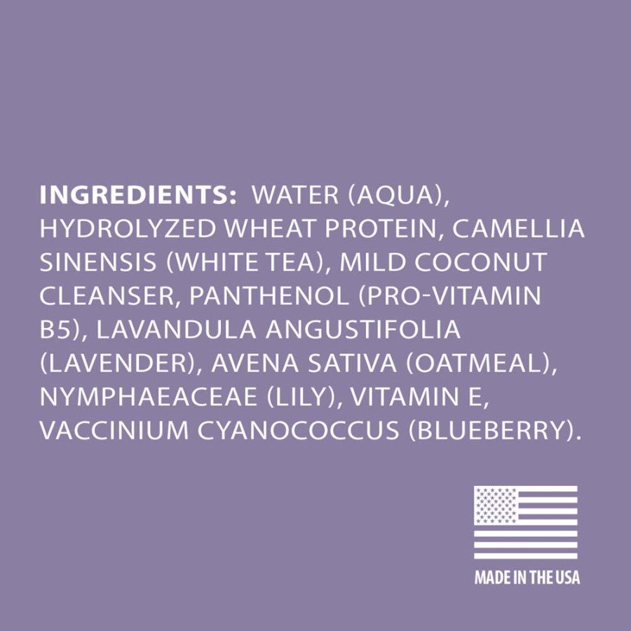- Ingredients: Water (Aqua), Hydrolyzed Wheat Protein, Camellia Sinensis (White Tea), Mild Coconut Cleanser, Panthenol (Pro-Vitamin B5), Lavandula Angustifolia (Lavender), Avena Sativa (Oatmeal), Nymphaeaceae (Lily), Vitamin E, Vaccinum Cyanococcus (Blueberry)