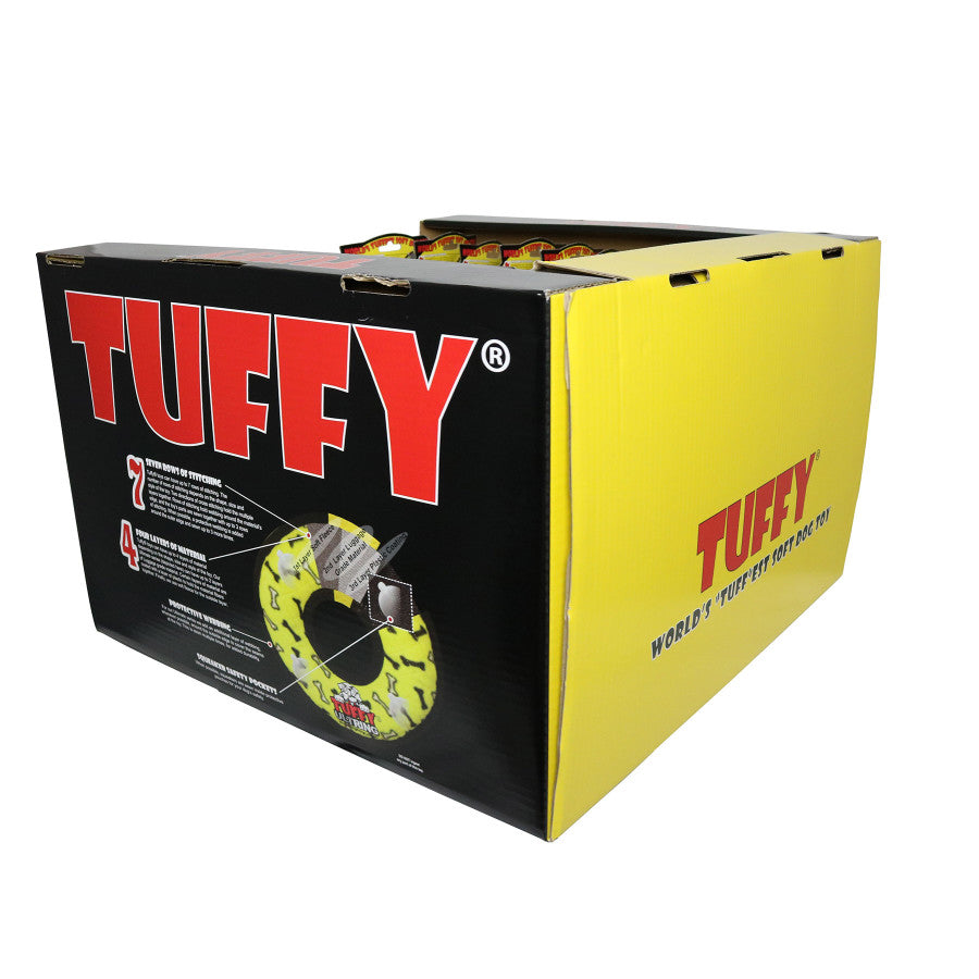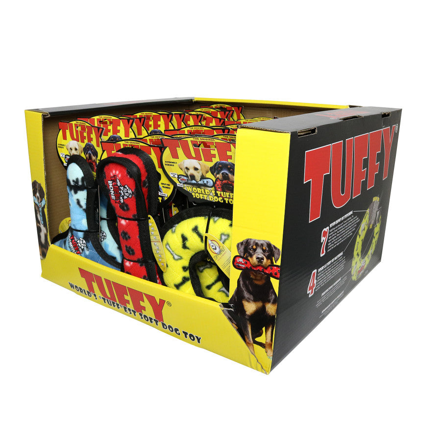 This PDQ comes in a stackable box that is packed with our best-selling TUFFY Ultimate Toys! PDQ displays are great for smaller retail spaces or checkout areas. No need to spend time stocking shelves or organizing how the toys will sit on a shelf or counter. This is ready to start selling straight from the box! Toys come in an eye-catching graphic box that will not only catch your customer's attention, but also educate them on the TUFFY brand. TUFFY dog toys are the most durable, soft dog toy on the market! With up to 4 layers of material, our toys are bonded & sewn together for added durability. Squeakers are sewn inside protective pouches. TUFFY toys float & are machine washable.