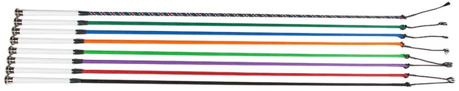 USWhip hog show whip 36in shaft with 6in replaceable popper. Soft molded handle with chrome ferrule and end cap. Available in natural, tan, black, red, blue, green, purple, neon pink, neon green, neon orange and splatter.