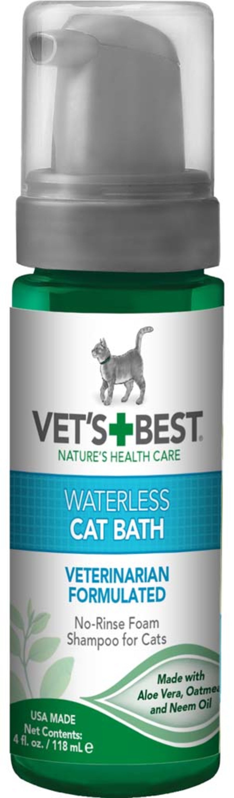 Vet’s Best Waterless Cat Bath (4 oz) No Rinse Waterless Dry Shampoo is a soothing mix of Aloe Vera, Neem Oil, Vitamin E, and Oatmeal that gently cleans, conditions and moisturizes your cat’s skin and coat. Our stress-free application makes it easier to keep your cast smelling fresh while helping to extend the time between baths. For over 30 years, Vet’s Best has blended natural ingredients that work together to comfort and protect your pet.