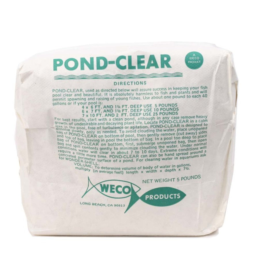 - Use Instructions: Pond-clear, used as directed below will assure success, in keeping your fish pool clear and beautiful. It is absolutely harmless to fish and plants and will permit spawning and raising of young fishes. Use about one pound to each 40 gallons or if your pool is:4 x 6 ft. and 1 1/4 ft. Deep use 5 pounds6 x 7 ft. and 1 1 /2 ft. Deep use 10 pounds7 x 10 ft. and 2 ft. Deep use 25 poundsFor best results, start with a clean pond, although in any case remove heavy growth of undesirable and decaying plant life, locate pond-clear in a calm area in the pool, free of turbulence or agitation. Pond-clear is designed to only as needed. 10 avoid clouding the water, place unopened hag of pond-clear on bottom of pool, then gently remove (cut away) sides and top of bag, leaving in pool the bottom of bag, in a pool too deep to plate cad pond-clear on the bottom, first, submerge unopened bag, then open bay and spill contents gently to minimize clouding the water. Under normal conditions, watt, will clear in about 7 to 10 days. Extreme conditions will require a little more time; pond-clear can also be hand spread around a concreted perimeter surface of a pond. For clearing water in aquariums ask wonder-shell.