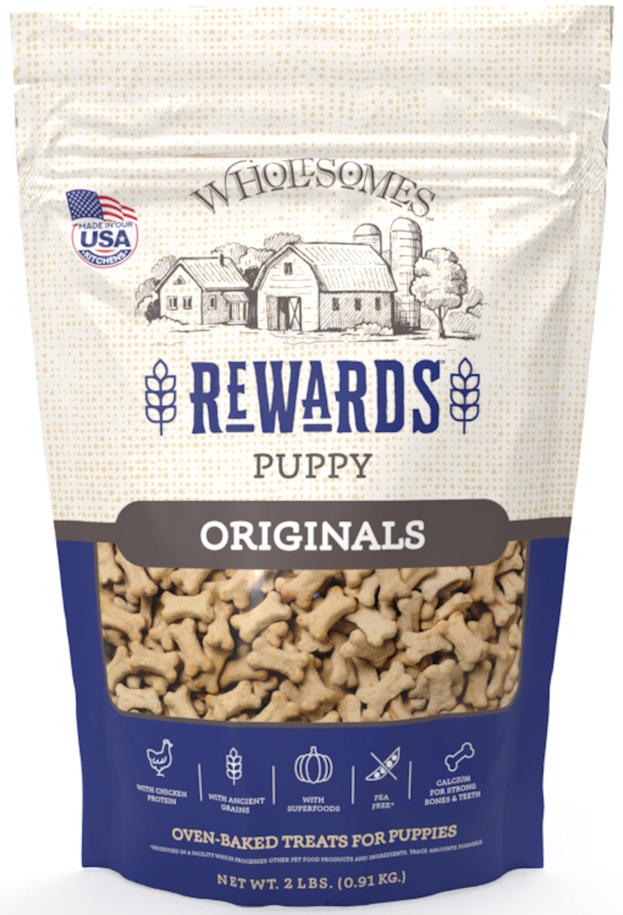 Rewards Puppy oven-baked biscuits are proudly made in family-owned, USA kitchens. The crunchy texture helps keep your puppy’s teeth clean and breath fresh. Each puppy biscuit treat is made with high quality chicken protein, ancient grains like oatmeal for heart health, and superfoods like pumpkin and sweet potato. These pea-free crunchy treats are also enriched with calcium to help build strong bones and teeth. Use as a training aid or as a reward!
