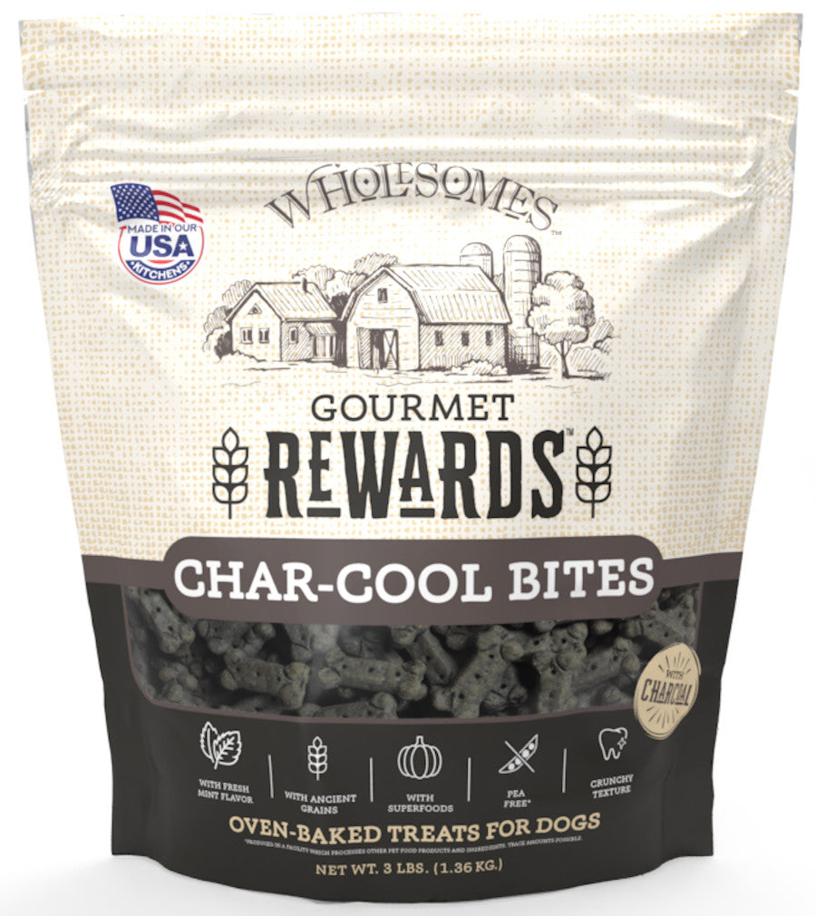 Gourmet Rewards Char-cool Bites are oven-baked and proudly made in family-owned, USA kitchens. Munching on these treats, with added charcoal and natural mint flavor, helps support fresh breath and a clean mouth. Each dog biscuit treat is made with high quality chicken protein, ancient grains like oatmeal for heart health, and superfoods like pumpkin and sweet potato to help support a fit lifestyle for your dog. Use these crunchy treats as a reward or training aid!