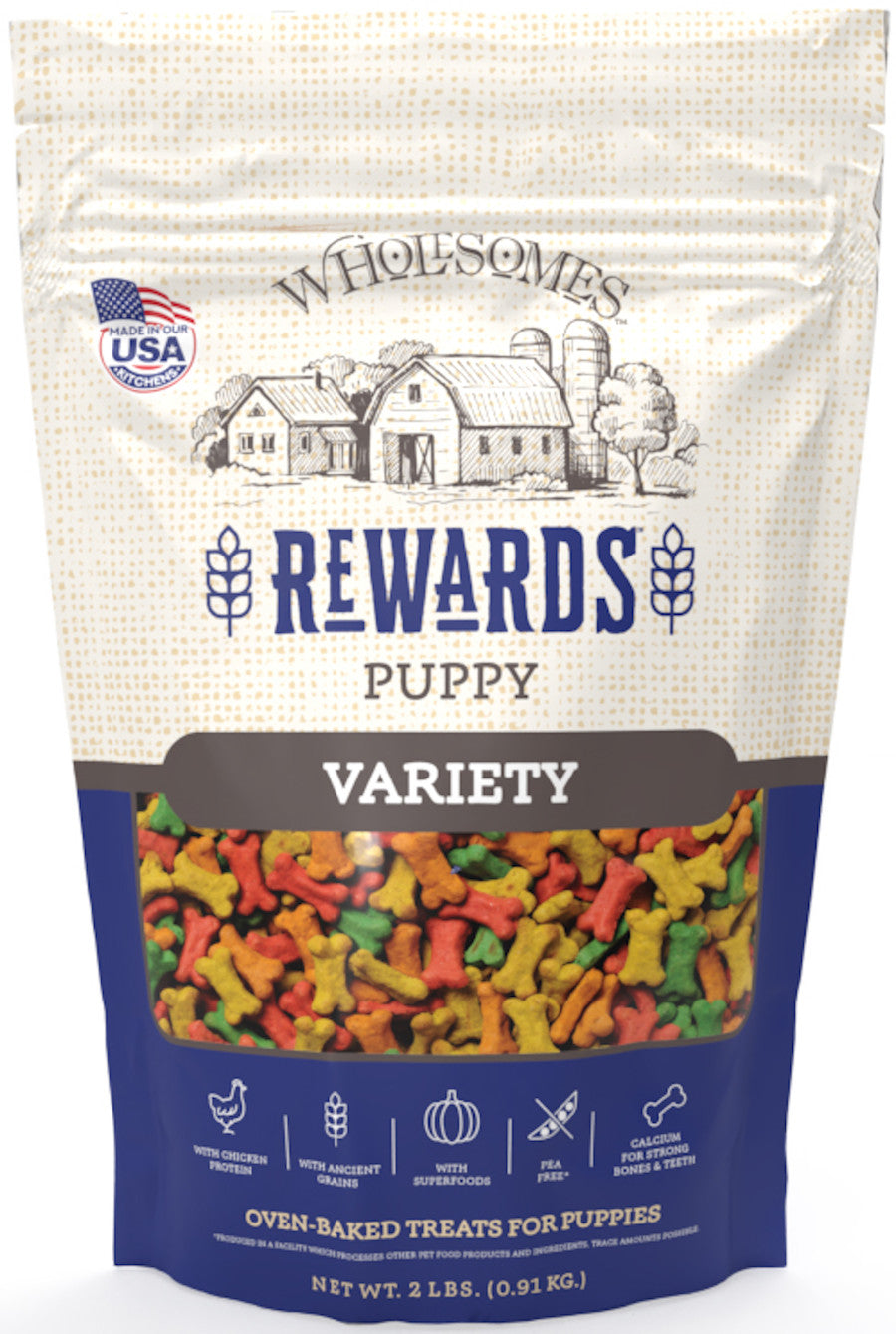 Wholesomes Rewards Variety oven-baked biscuits are proudly made in family-owned, USA kitchens. The crunchy texture helps keep your dog's teeth clean and breath fresh. Each biscuit treat is made with high quality chicken protein, ancient grains like oatmeal for heart health, and superfoods like pumpkin and sweet potato to help support all your puppy’s “play hard” and “sleep hard” daily schedule. These pea-free crunchy treats are also enriched with calcium to help build strong bones and teeth. Use as a training aid or as a reward!