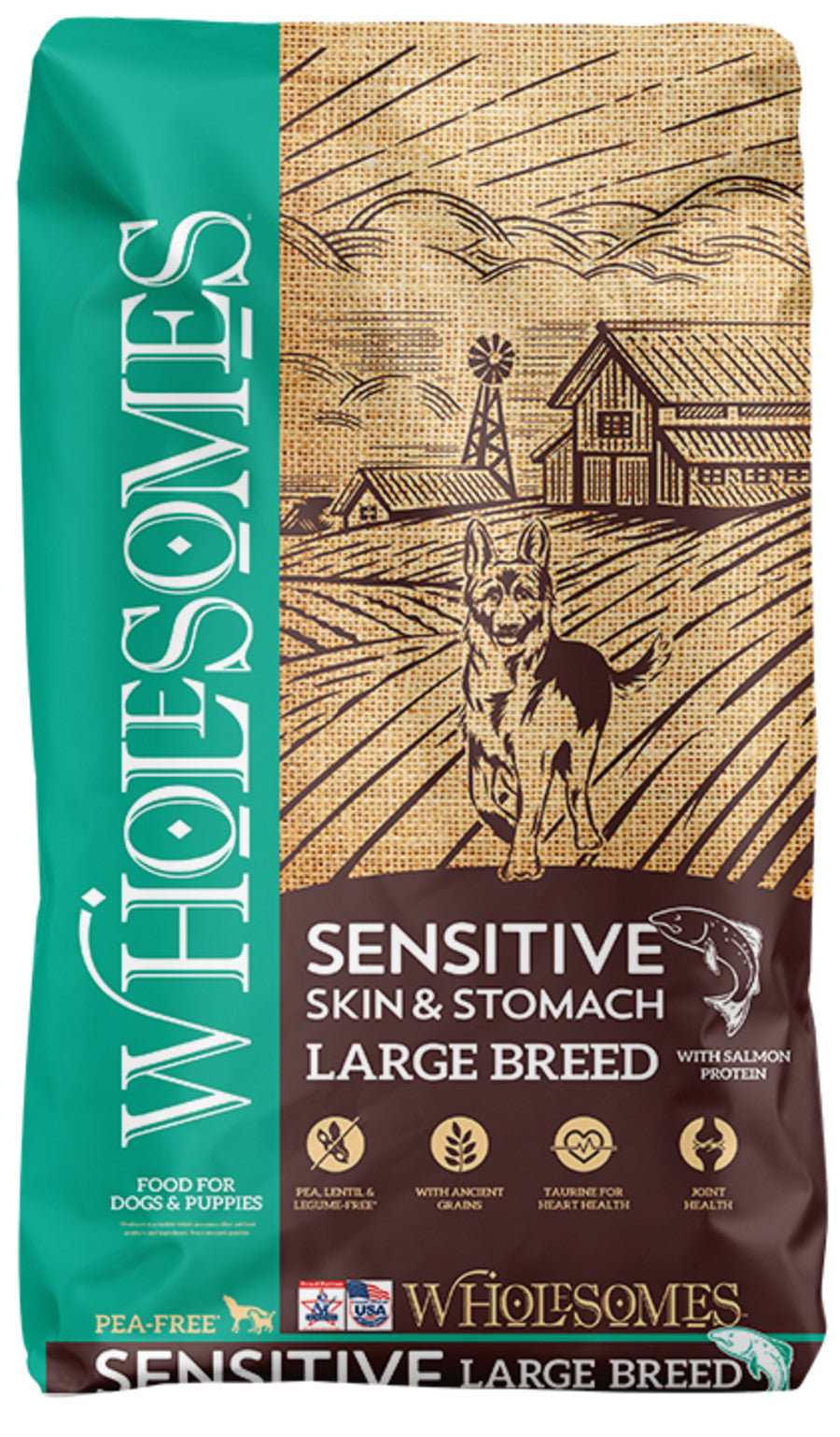 Packed with easily digestible proteins and quality ancient grains, Wholesomes Sensitive Skin & Stomach Large Breed provides great tasting nutrition for puppies and adult dogs, including large breeds, with sensitive skin or stomach. Quality salmon protein provides a natural source of Glucosamine and Chondroitin for joint health. DHA helps aid in brain and eye development. Added Taurine helps support heart health and omega fatty acids nourish your dog’s skin and coat.