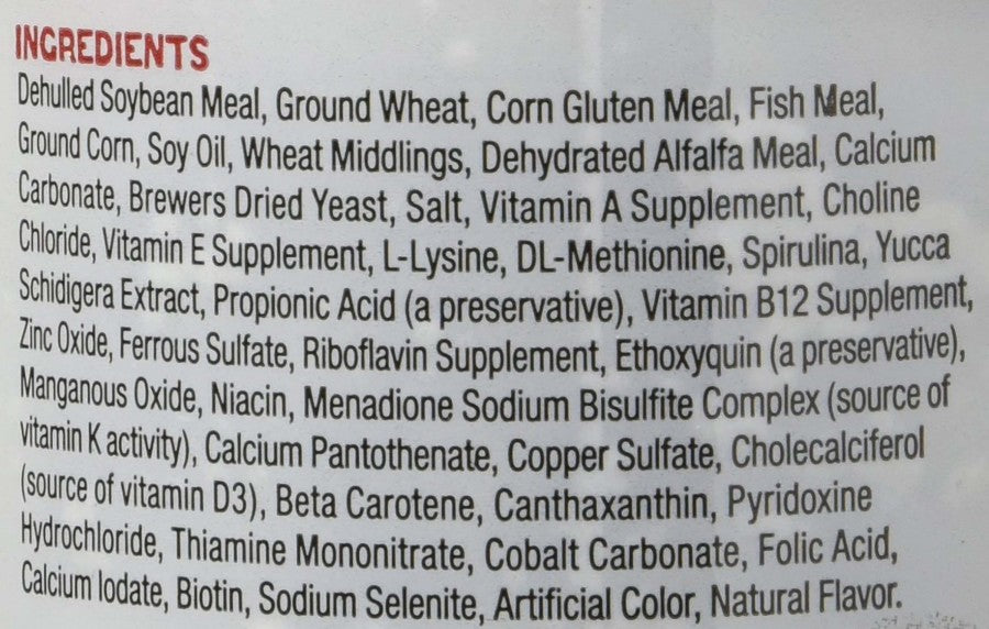- Ingredients: Dehulled Soybean Meal, Ground Wheat, Corn Gluten Meal, Fish Meal, Ground Corn, Soy Oil, Wheat Middlings, Dehydrated Alfalfa Meal, Calcium Carbonate, Brewers Dried Yeast, Salt, Vitamin A Supplement, Choline Chloride, Vitamin E Supplement, L-Lysine, Dl-Methionine, Spirulina, Yucca Schidigera Extract, Propionic Acid (a Preservative) Vitamin B12 Supplement, Zinc Oxide, Ferrous Sulfate, Riboflavin Supplement, Ethoxyquin (a Preservative), Manganous Oxide, Niacin, Menadione Sodium Bisulfite Complex (Source of Vitamin K Activity), Calcium Pantothenate, Copper Sulfate, Cholecalciferol (Source of Vitamin D3), Beta Carotene, Canthaxanthin, Pyridoxine Hydrochloride, Thiamine Mononitrate, Colbalt Carbonate, Folic Acid, Calcium Iodate, Biotin, Sodium Selenite, Artificial Color, Natural Flavor