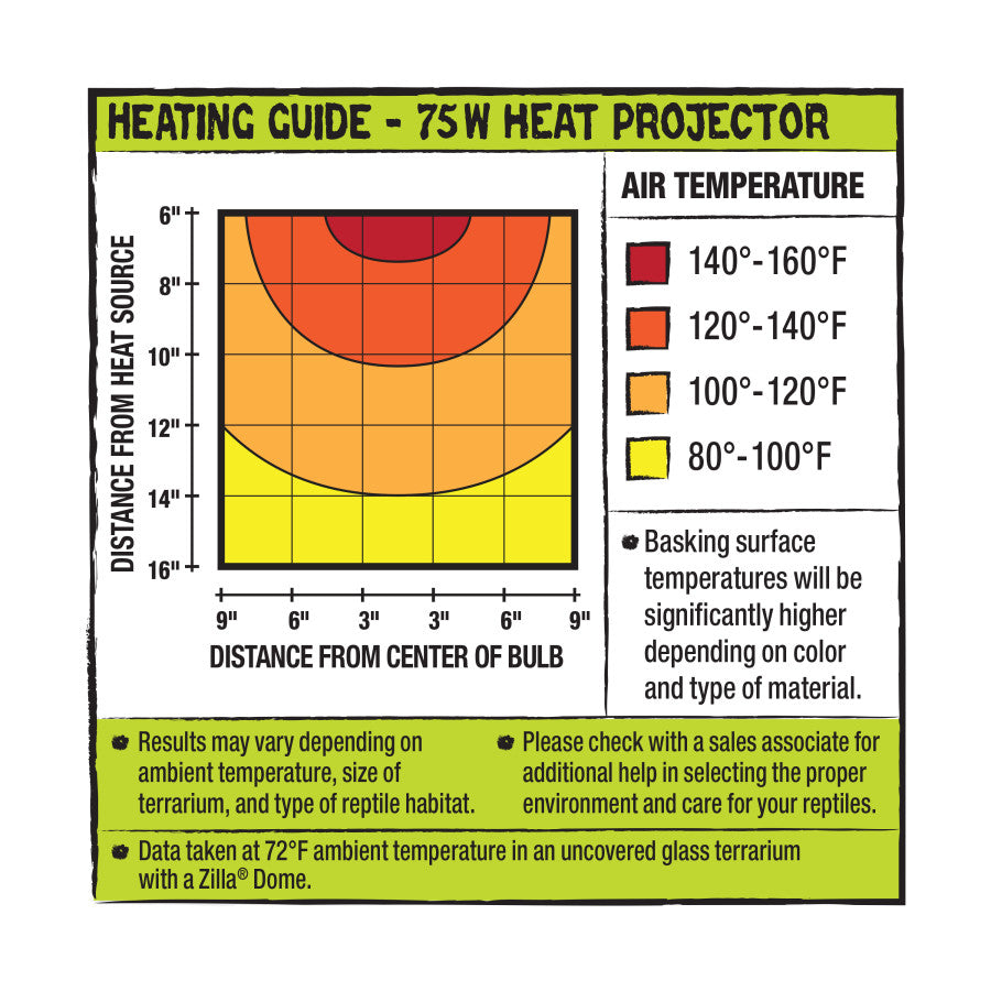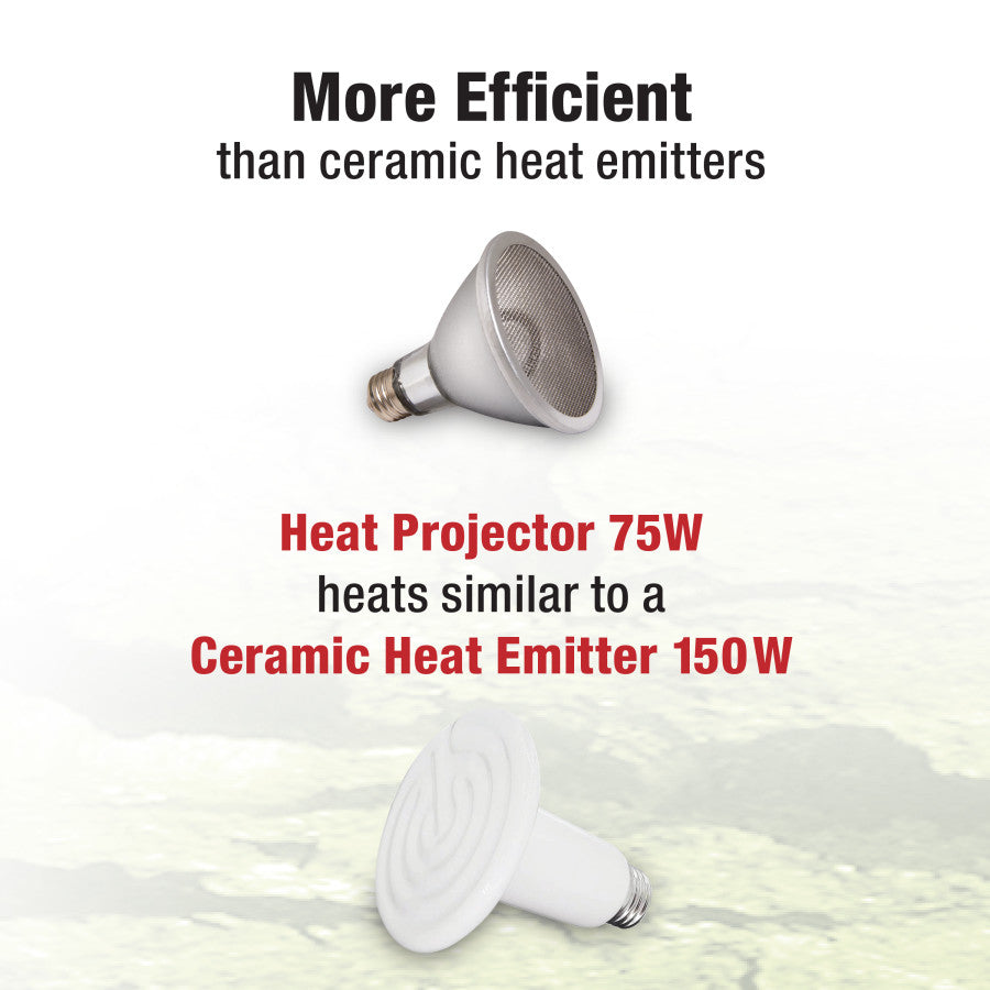 Provide 24/7 heat without disturbing reptiles while they sleep! Zilla® Heat Projectors Infrared A & B mimic the sun’s rays and provide a deep heat to reptiles to warm them up gently. The wide beam of heat efficiently directs heat into the terrarium and gives reptiles a more natural heating effect. The Zilla® Heat Projectors are more efficient than ceramic heat emitters, and when compared to halogen bulbs, they save energy and are safer. The durable, metal construction provides a long life of use. Fits Zilla® Reflector Dome and Premium Reflector Dome sizes 5.5” and 8.5”. Place lamp above basking area with a minimum of 8” between lamp and surface of basking area. Lamp may need to be placed further away to maintain ideal temperatures for animal. Available in 50 watts and 75 watts.