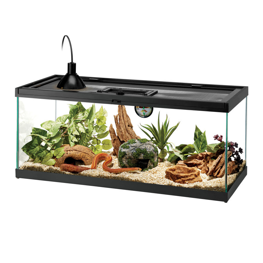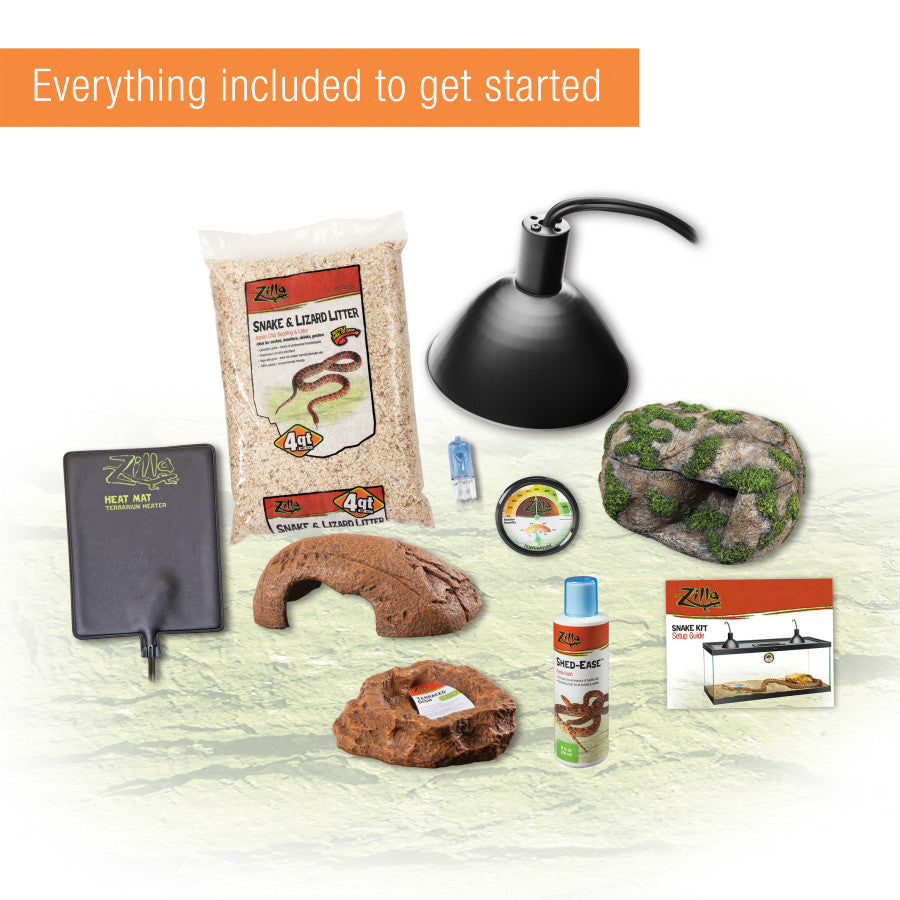 - Kit includes these Zilla® products: 20L Glass Terrarium, Screen Cover with Feeding Door, Halogen Mini Dome, Mini Halogen Day Blue Bulb 50W, Snake & Lizard Litter, Heat Mat, Shed Ease, Rock Den, Rock Lair, Terraced Dish, Humidity & Temperature Gauge, Setup Guide.