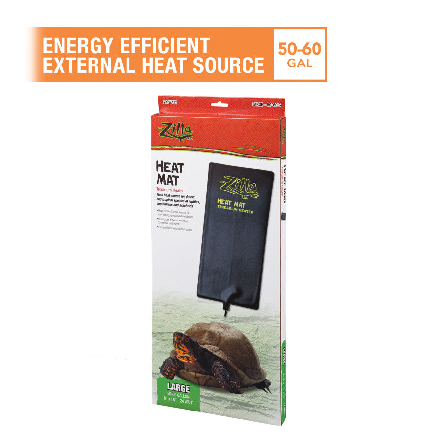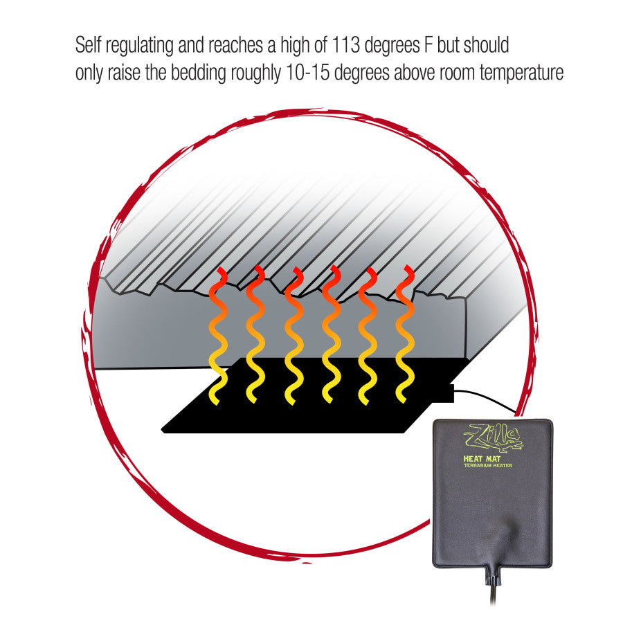Reptiles rely on external heat sources to elevate their body temperature. Zilla Heat Mat Terrarium Heaters provide warmth for reptiles to absorb from their surrounding environment in order to maintain and thermo-regulate heat used for daily activities, appetite and digestion. Carbon fiber heating technology efficiently radiates infrared waves creating uniform heating with no hot spots. Carbon fiber is an energy-efficient method for heating with no wires that might become pinched or broken. Each unit has adhesive backing and is low voltage with a maximum temperature of 113F. The material properties restrict it from getting warmer and remove the need for a thermal switch, which often fail.