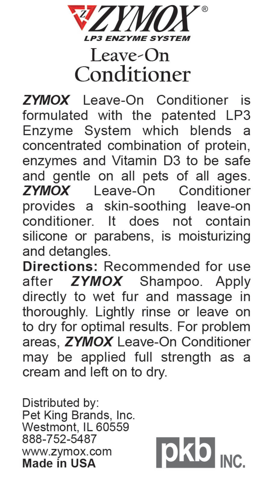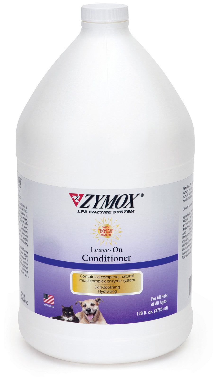 Veterinarian recommended. ZYMOX ®Leave-On Conditioner provides skin soothing conditioning of the coat and skin formulated with the patented LP3 Enzyme System which blends a combination of protein, enzymes and Vitamin D3. ZYMOX Leave-On Conditioner is safe and gentle for all pets of all ages. Moisturizes and detangles. May be rinsed off, left on or applied full strength to areas needing extra attention. Features a pleasant fragrance. Dries non-greasy. Non-toxic.