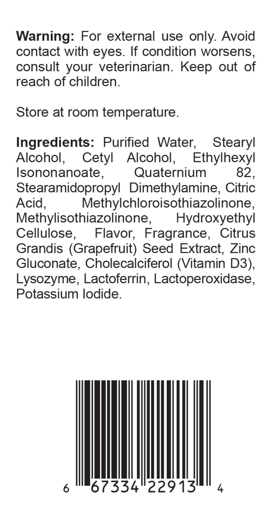 - Ingredients: Cetyl Alcohol, Citric Acid, Cholecalciferol (Vitamin D3), Citrus Grandis (Grapefruit) Seed Extract, Ethylhexyl Isononanoate, Flavor, Fragrance, Hydroxyethyl Cellulose, Lactoferrin, Lactoperoxidase, Lysozyme, Methylchloroisothiazolinone, Methylisothiazolinone, Potassium Iodide, Purified Water, Quaternium 82, Stearamidopropyl Dimethylamine, Stearyl Alcohol, Zinc Gluconate